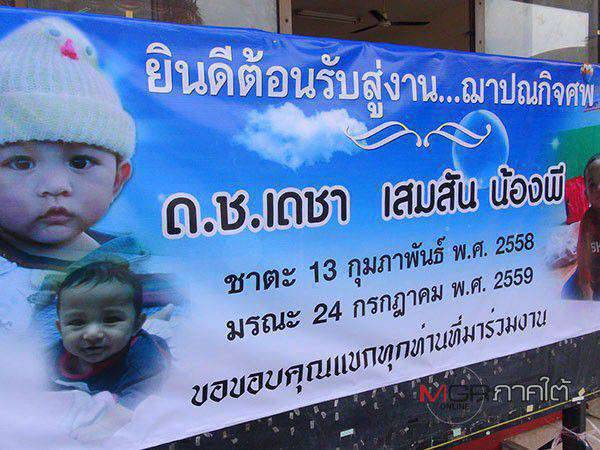 วันนี้ (28 ก.ค.) เวลา 11:35 น. ผู้สื่อข่าวผู้จัดการออนไลน์รายงานความคืบหน้า กรณี ด.ช.เดชา เสมสัน หรือน้องพีพี อายุ 1 ขวบ 5 เดือน ถูกพ่อเลี้ยงทำร้ายจนเสียชีวิตจากความเมา เมื่อวันที่ 24 ก.ค.ที่ผ่านมา และขณะนี้ ศพได้ตั้งบำเพ็ญกุศลอยู่ที่ศาลา 2 วัดศรีสว่างวงศ์ หรือวัดเกาะเสือ ใน อ.หาดใหญ่ จ.สงขลา และจะมีพิธีฌาปนกิจในช่วงบ่ายของวันนี้ แม้จะมีญาติฝ่ายพ่อแท้ๆ จะมาคัดค้านไม่ให้เผา โดยต้องการนำไปฝังตามหลักศาสนาอิสลาม เนื่องจากทั้งพ่อและแม่นับถือศาสนาอิสลาม