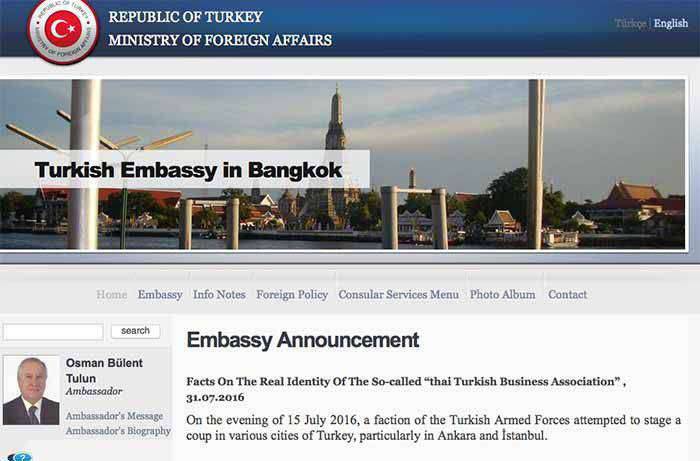 “เมื่อวันอาทิตย์ ที่ 31 ก.ค.59 เว็บไซต์และเฟซบุ๊คของสถานเอกอัครราชทูตตุรกีประจำประเทศไทย ได้โพสต์ประกาศสถานทูต ที่มีเนื้อหากล่าวถึงเหตุรัฐประหารที่ล้มเหลวในตุรกีซึ่งเกิดขึ้น เมื่อเย็นของวันที่ 15 กรกฎาคม 2559 ที่ผ่าน โดยทางการตุรกีเชื่อว่าเป็นฝีมือของนายฟัตฮุลเลาะห์ กูเลน ที่มีเครือข่ายในนาม FETO