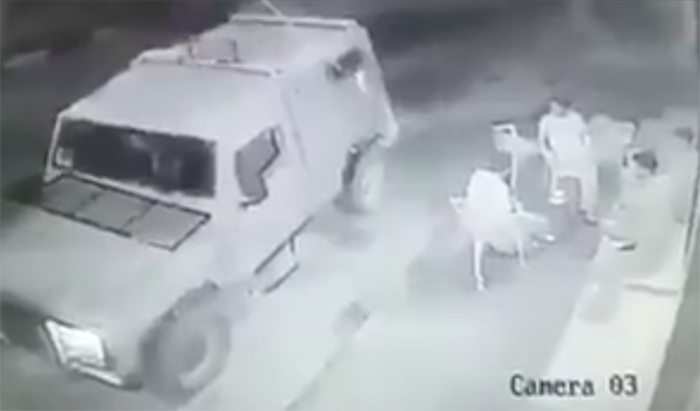 ในคลิปความยาวหนึ่งนาทีเผยให้เห็นรถทหารได้หยุดใกล้กับกลุ่มชาวปาเลสไตน์ 4 คน ที่นั่งอยู่บนเก้าอี้นอกร้านกาแฟ