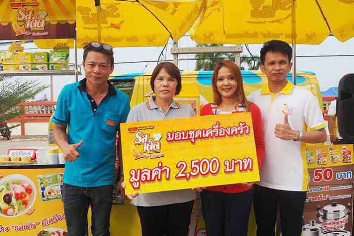นางสาวณิชรัตน์ ชำนาญกิจ (ที่ 2 จากขวา) รองผู้อำนวยการฝ่ายการตลาด บริษัท โรงงานผลิตภัณฑ์อาหารไทย จำกัด ผู้ผลิตและจัดจำหน่าย ผงปรุงสำเร็จตรา “รสเด็ด” มอบโชคชุดเครื่องครัวแสตนเลส มูลค่า 2,500 บาท ให้แก่ นางวาสนา อินทสโร ซึ่งเป็นหนึ่งผู้โชคดีจากกิจกรรมโรดโชว์ผลิตภัณฑ์ผงปรุงสำเร็จตรารสเด็ด เพียงลูกค้าซื้อผลิตภัณฑ์ ตรารสเด็ด รสชาติใดก็ได้ ครบ 50 บาท รับฟรีคูปอง 1 ใบ เขียนชื่อ-ที่อยู่ และเบอร์โทร ลุ้นรับรางวัลมากมาย ณ ตลาดนัดวัดสำโรง อ.อินทร์บุรี จ.สิงห์บุรี เมื่อเร็วๆ นี้