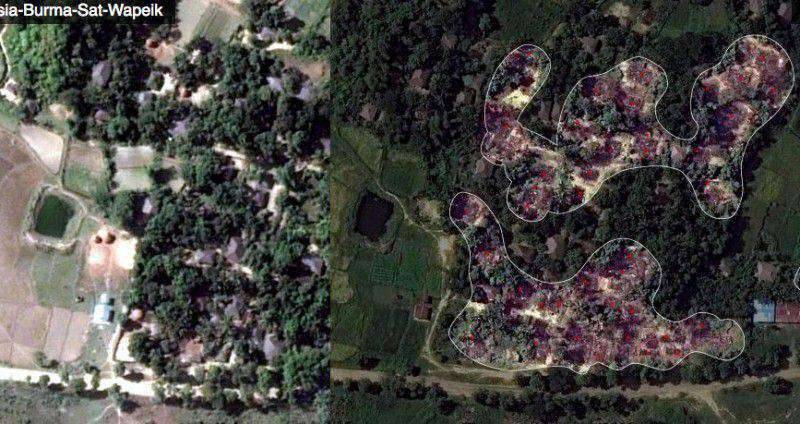 ภาพถ่ายดาวเทียมความละเอียดสูง ซึ่งถูกเผยแพร่ผ่านเว็บไซต์ เมื่อวันที่ 13 พ.ย. โดยฮิวแมนไรตส์วอตช์ (Human Rights Watch – HRW) องค์กรด้านสิทธิมนุษยชน ที่มีสำนักงานใหญ่อยู่ในนครนิวยอร์ก เผยให้เห็นความเสียหายอย่างกว้างขวางจากการเผาทำลายหมู่บ้านของชาวโรฮิงญาในรัฐยะไข่ของพม่า