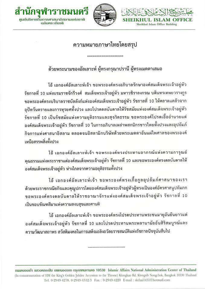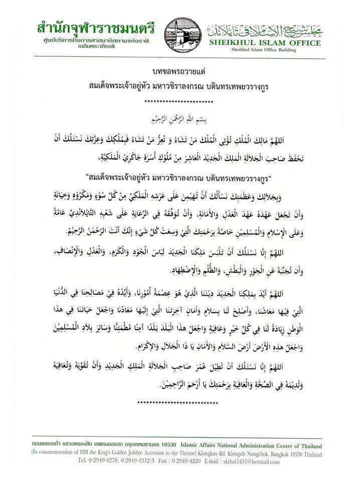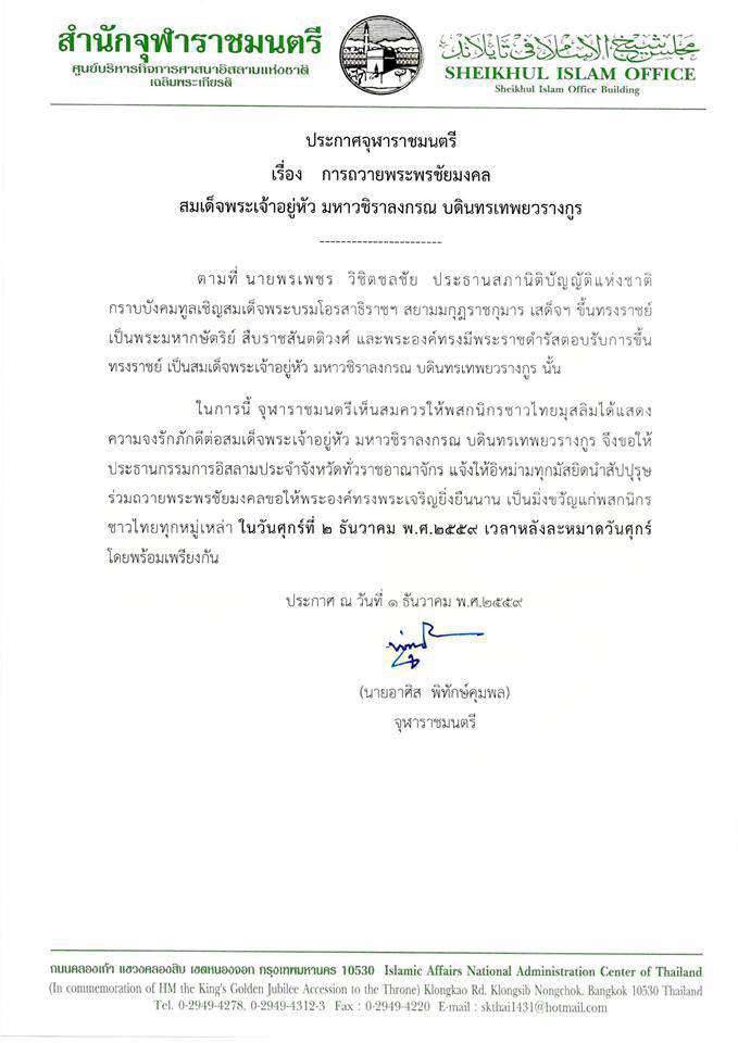 สำนักจุฬาราชมนตรี โดยนายอาศิส พิทักษ์คุมพล จุฬาราชมนตรี ออกหนังสือด่วนที่สุด ลงวันที่ 1 ธันวาคม 2559 โดยขอให้ประธานกรรมการอิสลามประจำจังหวัดทั่วราชอาณาจักร ได้แจ้งให้อิหม่ามทุกมัสยิดนำสัปปุรุษร่วมถวายพระพรชัยมงคล แด่สมเด็จพระเจ้าอยู่หัว มหาวชิราลงกรณ บดินทรเทพยวรางกูร ขอให้พระองค์ทรงพระเจริญยิ่งยืนนาน เป็นมิ่งขวัญแก่พสกนิกรชาวไทยทุกหมู่เหล่า (ตามบทขอพรดังแนบ) ในวันศุกร์ที่ 2 ธันวาคม พ.ศ.2559 เวลาหลังละหมาดวันศุกร์ โดยพร้อมเพรียงกัน