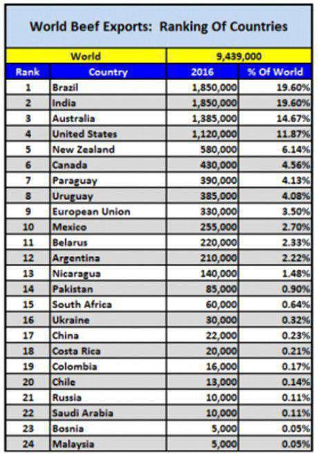 อินเดีย บราซิล สหรัฐอเมริกา และออสเตรเลีย รวมกันแล้วคิดเป็น 66% ของผู้ส่งออกเนื้อทั่วโลก ในขณะที่จีนเป็นผู้นำเข้าเนื้อมากที่สุดของโลก ตามมาด้วยญี่ปุ่น รัสเซีย และเกาหลีใต้