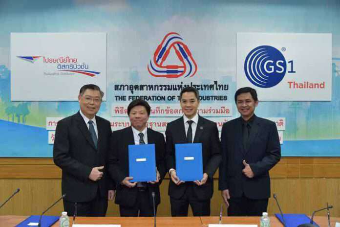 กรุงเทพฯ 15 มีนาคม 2560 – ดร.ฐิติพงศ์ นันทาภิวัฒน์ รักษาการกรรมการผู้จัดการ บริษัท ไปรษณีย์ไทยดิสทริบิวชั่น จำกัด (ปณท.ดบ.) บริษัทในเครือบริษัท ไปรษณีย์ไทย จำกัด (ปณท) (ที่ 3 จากซ้าย) และนายประวิทย์ โชติปรายนกุล ผู้อำนวยการสถาบันรหัสสากล สภาอุตสาหกรรมแห่งประเทศไทย (ที่ 2 จากซ้าย) ร่วมลงนามความร่วมมือการส่งเสริมการใช้งานระบบมาตรฐานสากล GS1 และฐานข้อมูลสินค้าแห่งชาติ เพื่อพัฒนาและส่งเสริมการนำบาร์โค้ดมาตรฐานสากล GS1 และการสื่อสารอิเล็กทรอนิกส์ไปใช้ในกระบวนการดำเนินงานด้านต่างๆ ของไปรษณีย์ไทยดิสทริบิวชั่น โดยพิธีลงนามความร่วมมือดังกล่าวจัดขึ้น เมื่อเร็วๆ นี้ ณ ห้อง ส.อ.ท.1 ชั้น 4 โซนซี สภาอุตสาหกรรมแห่งประเทศไทย คลองเตย กรุงเทพฯ