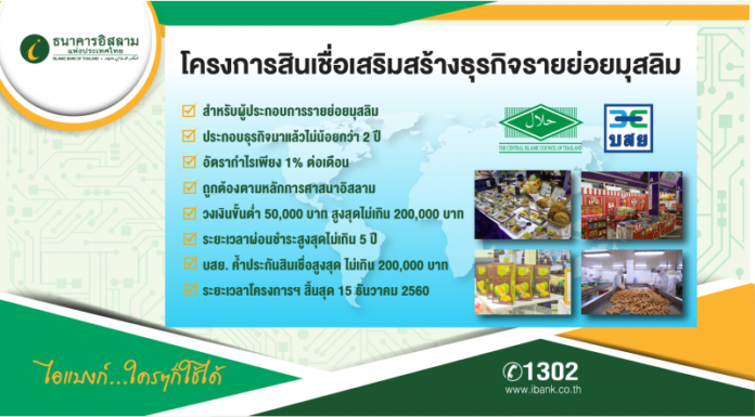 วันนี้ เพื่อเป็นการต่อยอดสินเชื่อธุรกิจมุสลิม ธนาคารอิสลามแห่งประเทศไทย (ไอแบงก์) จับมือกับบรรษัทประกันสินเชื่ออุตสาหกรรมขนาดย่อม (บสย.) เปิดตัวผลิตภัณฑ์ใหม่ “โครงการสินเชื่อเสริมสร้างธุรกิจรายย่อยมุสลิม” เพื่อยกระดับผู้ประกอบธุรกิจรายย่อยที่เป็นพี่น้องมุสลิมทั่วประเทศ โดยเฉพาะในพื้นที่จังหวัดภาคใต้ โดยให้วงเงินสินเชื่อต่อราย 50,000-200,000 บาท ระยะเวลาผ่อนนานสูงสุดถึง 5 ปี คิดอัตรากำไรเพียง 1 % ต่อเดือน และพิเศษสุด! ธนาคารขอมอบความคุ้มครองประกันอุบัติเหตุตะกาฟุล และการค้ำประกันสินเชื่อจาก บสย.ฟรี! เริ่มให้บริการแล้ววันนี้ ถึง 15 ธันวาคม ศกนี้ เท่านั้น ผู้สนใจสมัครขอรับบริการสินเชื่อดังกล่าวได้ที่ไอแบงก์ทุกสาขาทั่วประเทศ หรือสอบถามรายละเอียดเพิ่มเติม โทร. 1302