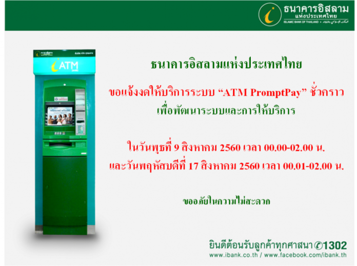 ธนาคารอิสลามแห่งประเทศไทย (ไอแบงก์) จะปิดปรับปรุงระบบ เพื่อให้มีประสิทธิภาพมากยิ่งขึ้น โดยจะดำเนินการปิดให้บริการระบบ ATM PromptPay ในวันที่ 9 สิงหาคม 2560 เวลา 00.00-02.00 น. และวันที่ 17 สิงหาคม 2560         เวลา 00.01-02.00 น.