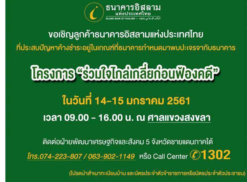 ธนาคารอิสลามแห่งประเทศไทย (ไอแบงก์) ขอเชิญลูกค้าธนาคารอิสลามแห่งประเทศไทย ที่ประสบปัญหาค้างชำระอยู่ในเกณฑ์ที่ธนาคารกำหนด มาพบปะเจรจากับธนาคาร ในโครงการ “ร่วมใจไกล่เกลี่ยก่อนฟ้องคดี” ณ ศาลแขวงสงขลา ในวันที่ 14-15 มกราคม 2561 เวลา 09.00-16.00 น. สอบถามรายละเอียดได้ที่ฝ่ายพัฒนาเศรษฐกิจและสังคม 5 จังหวัดชายแดนภาคใต้ โทร.074-223-807/ 063-902-1149 หรือ Call Center 1302