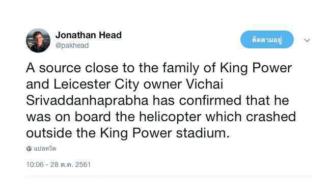 โจนาธาน เฮด ผู้สื่อข่าวบีบีซี ทวีตวันนี้ (28 ต.ค.) เวลาประมาณ 10.00 น. ว่า “แหล่งข่าวใกล้ชิดกับครอบครัวของ วิชัย ศรีวัฒนประภา เจ้าของคิงเพาเวอร์และเลสเตอร์ซิตี้ ได้ยืนยันว่าเขาอยู่บนเฮลิคอปเตอร์ลำที่ตกนอกสนามคิงพาวเวอร์”