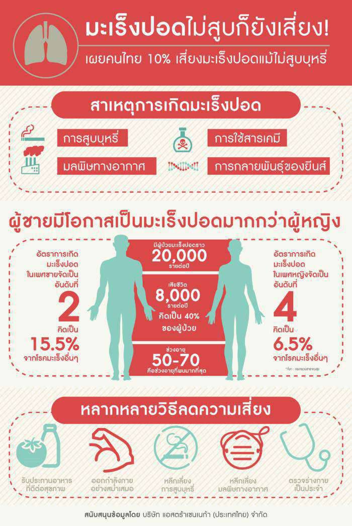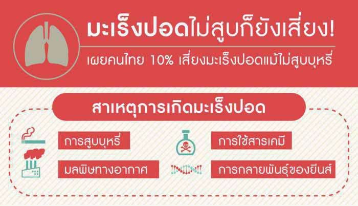 สถิติเผย 10% ของผู้ป่วยโรคมะเร็งปอดไม่ใช่ผู้ที่สูบบุหรี่ พบมะเร็งปอดในชายไทยเป็นอันดับ 2 และหญิงไทยเป็นอันดับ 4 ทุกปีมีผู้เสียชีวิตด้วยโรคมะเร็งปอดราว 8,000 รายจากทั้งหมด 20,000 ราย