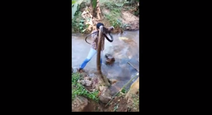 ภาพจากคลิปวิดีโอเผยให้เห็นหมองูลงไปในลำธารแล้วก็คว้าหางของงูตัวใหญ่นี้แล้วก็ลากมันขึ้นฝั่ง ขณะที่ชาวบ้านมมุงดูด้วยความกลัว หลังจากดึงงูขึ้นมาจากน้ำเขาก็ปล่อยมันเข้าป่าไป ตามรายงานของเชียไทมส์ นี่เป็นงูจงอางตัวที่ 150 ที่เขาได้ช่วยไว้แล้วก็ปล่อยสู่ป่า