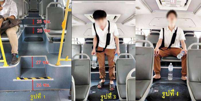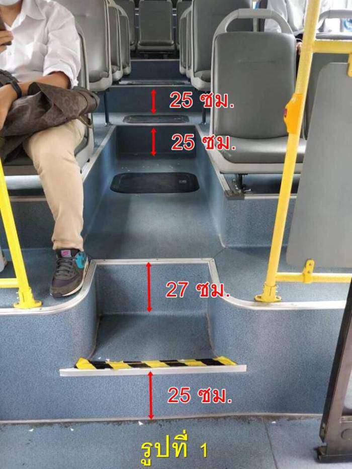 รูปที่ 1 แสดงความสูงของบันได จากพื้นระดับที่ 1 ขึ้นไปที่พื้นระดับที่ 2 มีขั้นบันได 2 ขั้น สูง 25 เซนติเมตร และ 27 เซนติเมตร ตามลำดับ จากพื้นระดับที่ 2 ขึ้นไปที่พื้นระดับที่ 3 มีขั้นบันได 1 ขั้น สูง 25 เซนติเมตร และจากพื้นระดับที่ 3 ขึ้นไปที่พื้นระดับที่ 4 มีขั้นบันได 1 ขั้น สูง 25 เซนติเมตร ความสูงของขั้นบันไดเหล่านี้สูงกว่าขั้นบันไดในบ้านพักที่กฎหมายกำหนดให้สูงไม่เกิน 18 เซนติเมตร แม้ว่ากฎหมายที่เกี่ยวกับการขนส่งไม่ได้กำหนดความสูงของขั้นบันไดภายในรถโดยสารไว้ก็ตาม แต่ ขสมก.ซึ่งเป็นหน่วยงานที่มีประสบการณ์ในการเดินรถควรตระหนักว่าขั้นบันไดที่สูงเกินไปจะทำให้ผู้โดยสารไม่ได้รับความสะดวกสบาย และอาจสะดุดขั้นบันไดจนทำให้เกิดอุบัติเหตุเป็นอันตรายได้ โดยเฉพาะผู้โดยสารสูงอายุ สตรีมีครรภ์ เด็ก และคนพิการที่ต้องเดินขึ้นลงขั้นบันไดในขณะที่รถเมล์กำลังวิ่งหรือรถตกหลุมบ่อ ซึ่งมีโอกาสสะดุดขั้นบันไดได้สูงมาก