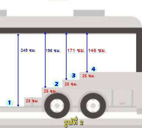 รูปที่ 2 แสดงความสูงจากพื้นรถถึงเพดานรถ ซึ่งจะเห็นได้ว่าความสูงจากพื้นระดับที่ 3 และระดับที่ 4 ถึงเพดานรถมีค่าเท่ากับ 171 เซนติเมตร และ 146 เซนติเมตร ตามลำดับ ถือว่าต่ำกว่าความสูงที่กฎหมายกำหนดไว้ให้มีความสูงไม่น้อยกว่า 175 เซนติเมตร