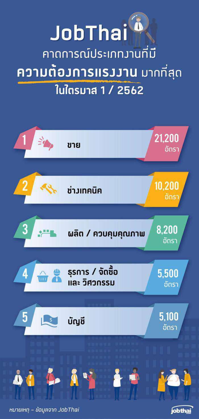 นางสาวแสงเดือน ตั้งธรรมสถิตย์ ผู้ร่วมก่อตั้งและหัวหน้าผู้บริหารด้านปฏิบัติการจ๊อบไทย (JobThai) กล่าวว่า จ๊อบไทยในฐานะผู้นำด้านบริการหางาน สมัครงานออนไลน์ อันดับ 1 ของประเทศไทย ที่มีผู้ลงทะเบียนฝากประวัติกว่า 1.5 ล้านคน และมีจำนวนงานจากบริษัทชั้นนำโดยเฉลี่ยอยู่ที่ 90,000 อัตราต่อวัน ได้ทำการรวบรวมและวิเคราะห์ฐานข้อมูลที่อยู่ในจ๊อบไทยเพื่อรายงานสถานการณ์ความต้องการแรงงานทั่วประเทศในช่วงไตรมาส 1 ประจำปี 2562 โดยพบว่า 5 ประเภทงานที่มีความต้องการแรงงานสูงสุด มีดังนี้