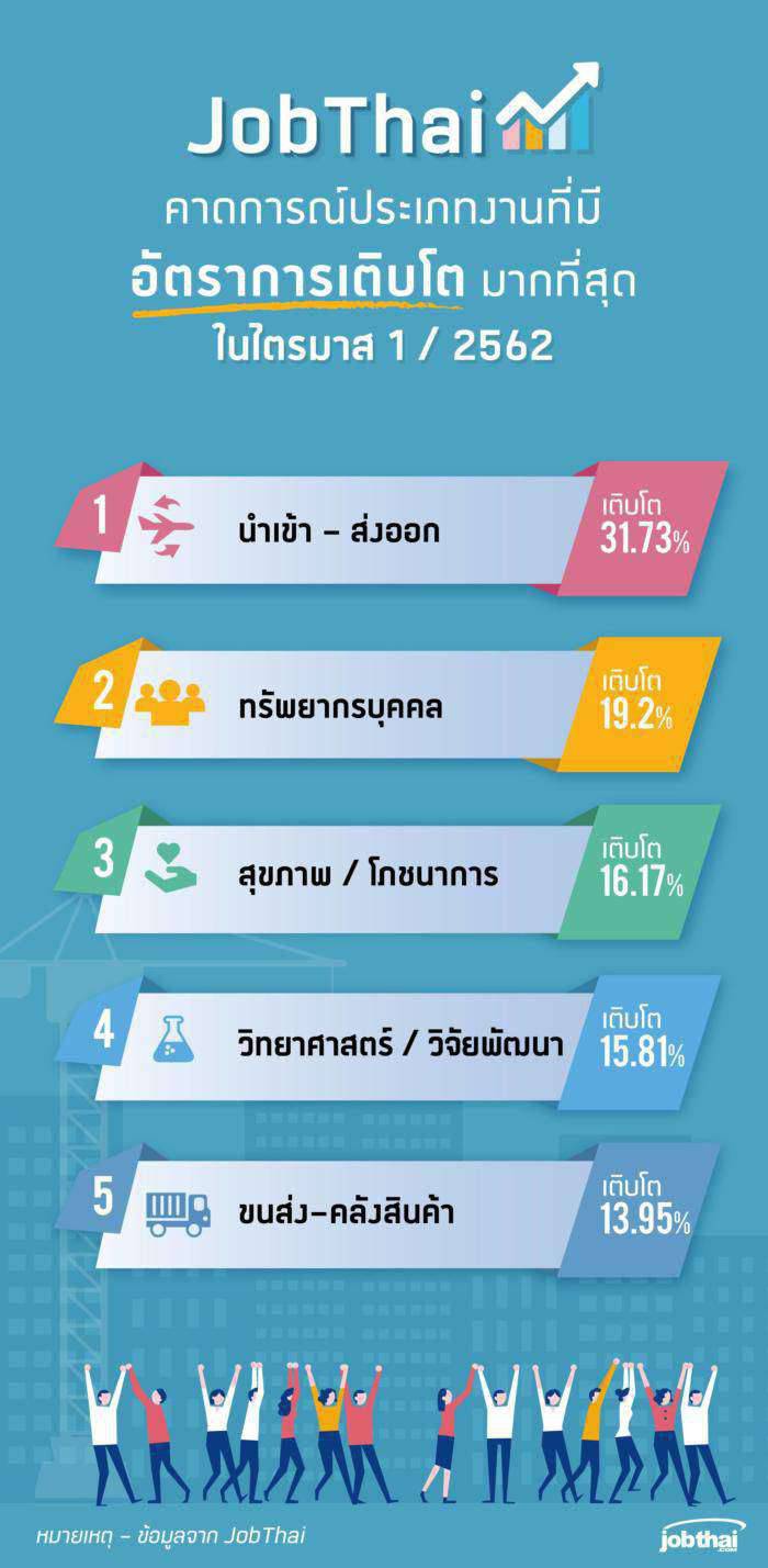 นอกจากนี้ จ๊อบไทยยังเผยให้เห็น 5 ประเภทงานที่คาดว่าจะมีอัตราการเติบโตมากที่สุดในไตรมาส 1 ปี 2562 เมื่อเทียบกับไตรมาส 4 ของปีนี้ ได้แก่ 1.งานนำเข้า-ส่งออก เติบโต 31.73 เปอร์เซ็นต์ 2.งานทรัพยากรบุคคล เติบโต 19.2 เปอร์เซ็นต์ 3.งานสุขภาพ/โภชนาการ เติบโต 16.17 เปอร์เซ็นต์ 4.งานวิทยาศาสตร์/วิจัยพัฒนา เติบโต 15.81 เปอร์เซ็นต์ และ 5.งานขนส่ง-คลังสินค้า เติบโต 13.95 เปอร์เซ็นต์ ตามลำดับ ซึ่งจะเห็นได้ว่าประเภทงานข้างต้นที่มีแนวโน้มการเติบโตที่สดใสนั้น สืบเนื่องจากปัจจัยสภาพเศรษฐกิจไทยที่มีแนวโน้มขยายตัวชัดเจนและต่อเนื่อง โดยแรงขับเคลื่อนหลักมาจากการใช้จ่ายภาคเอกชนทั้งการบริโภคและการลงทุนที่มีแนวโน้มขยายตัวดีขึ้น ตลอดจนแรงสนับสนุนจากโครงการลงทุนของภาครัฐที่ชัดเจนมากขึ้น อาทิ โครงการลงทุนโครงสร้างพื้นฐาน โครงการพัฒนาระเบียงเศรษฐกิจพิเศษภาคตะวันออก (EEC) ฯลฯ นอกจากนี้ภาคการส่งออกสินค้าก็มีแนวโน้มขยายตัวดีขึ้นตามอุปสงค์โลก และโรดแมปเลือกตั้งครั้งแรกในรอบ 8 ปีก็เป็นอีกสิ่งหนึ่งที่จะช่วยทำให้บรรยากาศการลงทุนในประเทศเริ่มกลับมาคึกคัก ซึ่งทั้งหมดนี้จะส่งผลดีมาถึงความต้องการแรงงานภาพรวมทั่วประเทศ นางสาวแสงเดือน กล่าวทิ้งท้าย