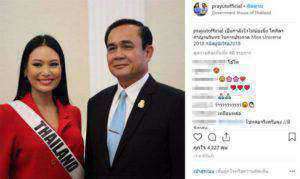 พล.อ.ประยุทธ์ จันทร์โอชา นายกรัฐมนตรี และหัวหน้าคณะรักษาความสงบแห่งชาติ (คสช.) ได้โพสต์อินสตาแกรมส่วนตัว prayutofficial โดยเป็นภาพถ่ายคู่กับ น้องนิ้ง โศภิดา กาญจนรินทร์ ตัวแทนสาวไทยผู้เข้าประกวดมิสยูนิเวิร์ส 2018