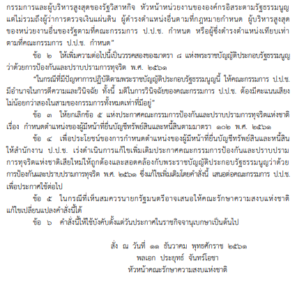 จึงจำเป็นต้องมีการปรับปรุงแก้ไข พ.ร.บ.ป.ป.ช. เพื่อให้การบังคับใช้กฎหมายเป็นไปตามเจตนารมณ์ของรัฐธรรมนูญเป็นส่วนสำคัญ ของการปฏิรูปประเทศด้านกฎหมาย อาศัยอำนาจตามความในมาตรา 265 ของรัฐธรรมนูญปี 2560 ประกอบกับมาตรา 44 ของรัฐธรรมนูญฉบับชั่วคราวปี 2557 หัวหน้า คสช. โดยความเห็นชอบจาก คสช. จึงมีคำสั่งดังต่อไปนี้