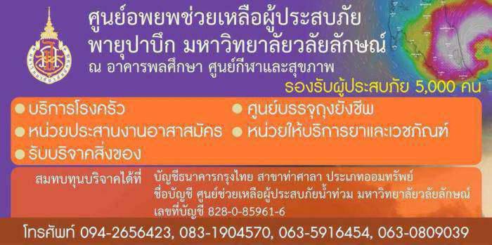 นอกจากนี้มหาวิทยาลัยวลัยลักษณ์ยังเปิดรับบริจาคเงินยาและเวชภัณฑ์รวมถึงสิ่งของจำเป็นต่างๆ เพื่อนำช่วยเหลือผู้ประสบภัยดังกล่าว โดยสามารถร่วมบริจาคเงินได้ที่บัญชีธนาคารกรุงไทย สาขาท่าศาลา ประเภทออมทรัพย์ ชื่อบัญชี ศูนย์ช่วยเหลือผู้ประสบภัยน้ำท่วม มหาวิทยาลัยวลัยลักษณ์ เลขที่บัญชี 828-0-85961-6 และรับบริจาคสิ่งของ ณ อาคารกิจกรรมนักศึกษา โทรศัพท์ 094-2656423, 083-1904570, 063-5916454, 063-080903