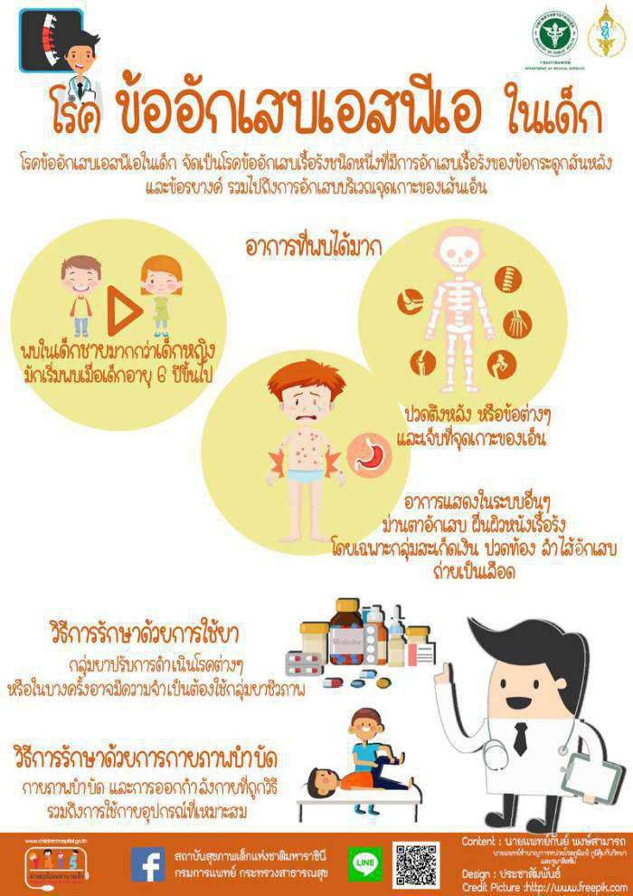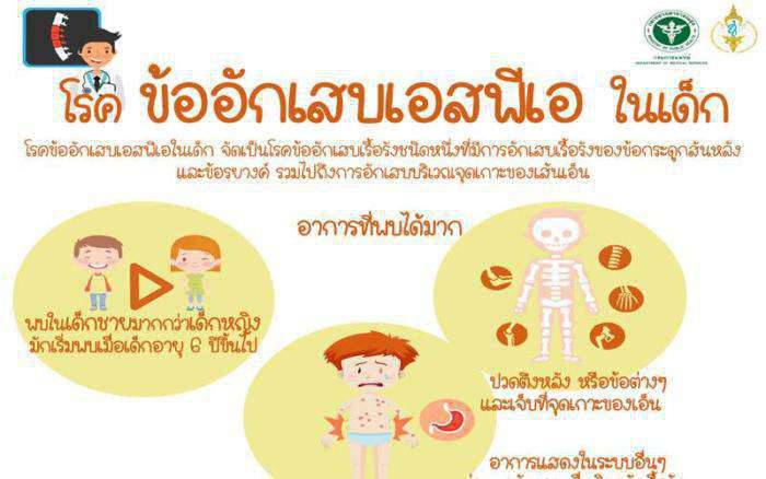 สถาบันสุขภาพเด็กแห่งชาติมหาราชินี กรมการแพทย์ กลุ่มโรคข้ออักเสบเอสพีเอในเด็กจัด เป็นโรคข้ออักเสบเรื้อรังชนิดหนึ่งที่มีการอักเสบเรื้อรังของข้อกระดูกสันหลังและข้อรยางค์ รวมไปถึงการอักเสบบริเวณจุดเกาะของเส้นเอ็น พบในเด็กชายมากกว่าเด็กหญิง มักเริ่มพบเมื่อเด็กอายุ 6 ปีขึ้นไป โดยมีอาการปวดตึงหลัง หรือข้อต่างๆ และเจ็บที่จุดเกาะของเอ็น มักมีอาการที่ขา นอกจากนี้อาจมีอาการแสดงในระบบอื่นๆ อาทิ ม่านตาอักเสบ ผื่นผิวหนังเรื้อรัง โดยเฉพาะกลุ่มสะเก็ดเงิน ปวดท้อง ลำไส้อักเสบ ถ่ายเป็นเลือด เป็นต้น
