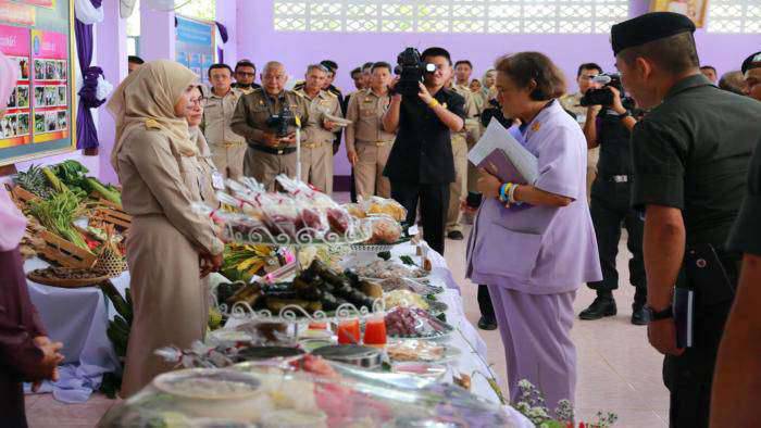 พระราชทานพันธุ์ไม้ผลแก่ผู้แทนชาวบ้าน 2 คน รับฟังการรายงานความก้าวหน้าการดำเนินงานของโรงเรียน โครงการพระราชดำริ สถานการณ์และแนวทางการแก้ไขปัญหาเรื่องน้ำบริโภคในโรงเรียน ทอดพระเนตรการสาธิตการเรียนการสอนคอมพิวเตอร์ ระดับชั้นประถมศึกษาปีที่ 4 – 6 การสาธิตการเรียนการสอนภาษาไทย ระดับชั้นประถมปีที่ 1 การสาธิตการเรียนการสอนตามโครงการ “บ้านนักวิทยาศาสตร์น้อย” ระดับชั้นอนุบาล 3 จากนั้นเสด็จฯ ไปยังโรงอาหารเพื่อทอดพระเนตรกิจกรรมประกอบเลี้ยงอาหารกลางวันของโรงเรียน ห้องพยาบาล การฝึกอาชีพนักเรียน โครงการเกษตรเพื่ออาหารกลางวัน กิจกรรมห้องสมุด สหกรณ์นักเรียน และเสด็จฯ ทอดพระเนตรโครงการนำร่อง “การเรียนรู้แปรรูปผลผลิตทางการเกษตร” และทรงเยี่ยมหน่วยแพทย์และหน่วยทันตกรรมพระราชทาน