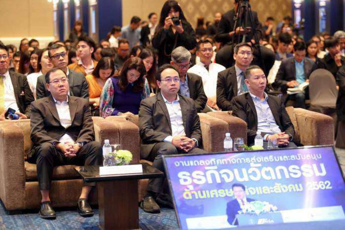 สำหรับการส่งเสริมและพัฒนาธุรกิจนวัตกรรมเพื่อสังคม จะมีการดำเนินการสนับสนุนในลักษณะเดียวกับการพัฒนาธุรกิจนวัตกรรมด้านเศรษฐกิจ แต่จะมีการอบรมบ่มเพาะผู้ประกอบการผ่านเครือข่ายที่เรียกว่า “หน่วยขับเคลื่อนนวัตกรรมเพื่อสังคม (Social Innovation Driving Unit)” ที่กระจายอยู่ใน 5 ภูมิภาค ทั้งภาคเหนือ ตะวันออกเฉียงเหนือ กลาง ตะวันออก และใต้ เพื่อส่งต่อมายังส่วนการสนับสนุนด้านเงินทุน โดยแบ่งเป็น 1) ธุรกิจนวัตกรรมเพื่อสังคมแบบมุ่งเป้า ในวงเงินสูงสุดไม่เกิน 1.5 ล้านบาท จะเน้นการแก้ปัญหาด้านสังคมปัญหาใดปัญหาหนึ่ง โดยนำนวัตกรรมรูปแบบต่างๆ ที่มีการพัฒนาต้นแบบหรือโมเดลที่สำเร็จแล้วให้สามารถกระจายสู่ชุมชน หรือองค์การปกครองส่วนท้องถิ่น มุ่งเน้นให้เกิดการแก้ปัญหาความเหลื่อมล้ำในจังหวัดยากจนของประเทศ หรือพื้นที่เป้าหมายนำร่อง ซึ่งองค์กรที่ได้รับคัดเลือกจะได้รับเงินสนับสนุนเพื่อนำไปดำเนินการจริงในพื้นที่ โดยมีโจทย์ที่สำคัญ ได้แก่ โครงการหมู่บ้านนวัตกรรมเพื่อสังคม หรือ Social Innovation Village ที่มุ่งแก้ไขปัญหา 3 พื้นที่เป้าหมาย ได้แก่ ชุมชนเมืองจัง อำเภอภูเพียง จังหวัดน่าน ชุมชนอุ้มผาง อำเภออุ้มผาง จังหวัดตาก และชุมชนหนองมะโมง อำเภอหนองมะโมง จังหวัดชัยนาท นอกจากนี้ ยังมีการเปิดรับข้อเสนอโครงการนวัตกรรมสำหรับเมืองและชุมชนตั้งแต่วันนี้ถึง 30 เมษายน 2562 ในหัวข้อนวัตกรรมการจัดการความเสี่ยงภัยพิบัติ นวัตกรรมบริการสาธารณะ และการยกระดับคุณภาพชีวิตของกลุ่มเปราะบาง ซึ่งนับว่าเป็นการพัฒนาโครงการนวัตกรรมเพื่อสังคมแบบมุ่งเป้าอีกรูปแบบหนึ่งที่เน้นแก้ปัญหาสังคมเมืองและชุมชนในหัวข้อที่เป็นประเด็นสำคัญในแต่ละปี และ 2) ธุรกิจนวัตกรรมเพื่อสังคมแบบเปิด ในวงเงินสูงสุดไม่เกิน 1.5 ล้านบาท ผ่าน 9 ด้าน ได้แก่ ด้านการอนุรักษ์สิ่งแวดล้อม ด้านความเชื่อมโยงระหว่าง อาหาร น้ำ และพลังงาน ด้านภาครัฐและการศึกษา ด้านการเงิน การจ้างงาน และสวัสดิการสังคม ด้านเกษตรกรรมยั่งยืน ด้านความเป็นเมือง ด้านสุขภาพ ด้านการท่องเที่ยวและวัฒนธรรม และ ด้านการจัดการภัยพิบัติ ส่วนธุรกิจ