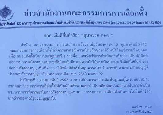 สำนักงานคณะกรรมการการเลือกตั้ง (กกต.) ได้ออกเอกสารข่าว ระบุว่า เมื่อวันอังคารที่ 12 กุมภาพันธ์ 2562 คณะกรรมการการเลือกตั้งได้พิจารณากรณีพรรคไทยรักษาชาติ (ทษช.) มีหนังสือแจ้งรายชื่อบุคคลเพื่อเสนอแต่งตั้งเป็นนายกรัฐมนตรี 1 รายชื่อ และเห็นว่าการดำเนินการดังกล่าวเป็นปฏิปักษ์ต่อการปกครองในระบอบประชาธิปไตยอันมีพระมหากษัตริย์ทรงเป็นประมุข จึงมีมติให้ยื่นคำร้องต่อศาลรัฐธรรมนูญเพื่อพิจารณาวินิจฉัยมีคำสั่งให้ยุบพรรคไทยรักษาชาติ ตามพระราชบัญญัติประกอบรัฐธรรมนูญว่าด้วยพรรคการเมือง พ.ศ. 2560 มาตรา 92