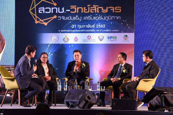 วันที่ 21 กุมภาพันธ์ 2562 ที่ อ.หาดใหญ่ จ.สงขลา: สำนักงานพัฒนาวิทยาศาสตร์และเทคโนโลยีแห่งชาติ (สวทช.) กระทรวงวิทยาศาสตร์และเทคโนโลยี จัดงานประชุมสัมมนาและแสดงนวัตกรรม “สวทช.-วิทย์สัญจร” (ภาคใต้) จังหวัดสงขลา ภายใต้แนวคิด “วิจัยเข้มแข็ง เสริมแกร่งภูมิภาค” เพื่อเผยแพร่ผลงานวิจัย สวทช. และเครือข่ายพันธมิตรสู่ทุกภาคส่วนทั้งการเกษตร การศึกษา ผู้ประกอบการSME และเอกชน เพื่อให้เกิดการนำงานวิจัยไปใช้ประโยชน์ต่อยอดในเชิงพาณิชย์และสาธารณประโยชน์ โดยมีนายอำพล พงศ์สุวรรณรองผู้ว่าราชการจังหวัดสงขลา ดร.ณรงค์ ศิริเลิศวรกุล ผู้อำนวยการ สวทช. ร่วมด้วยผู้ว่าราชการจังหวัดในภาคใต้ หัวหน้าส่วนราชการ คณาจารย์ นักเรียน นักวิจัย ผู้แทนจากสภาอุตสาหกรรม หอการค้า ผู้ประกอบการ เกษตรกร และประชาชนกว่า 500 คนเข้าร่วมงาน