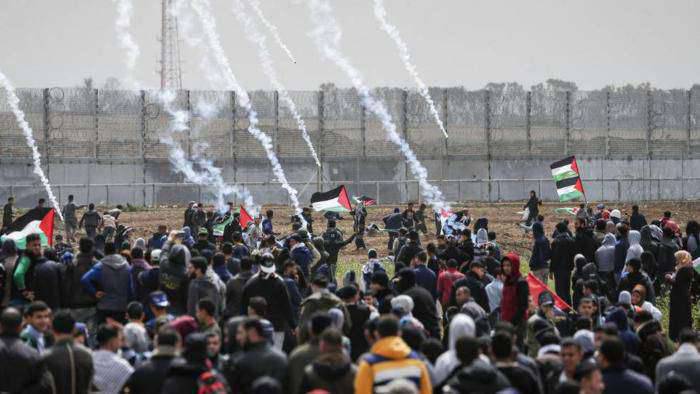 ชาวปาเลสไตน์หลายกลุ่มพยายามที่จะทำลายรั้วชายแดน ในขณะที่กองกำลังความมั่นคงของอิสราเอลยิงแก๊สน้ำตาใส่ผู้ประท้วง