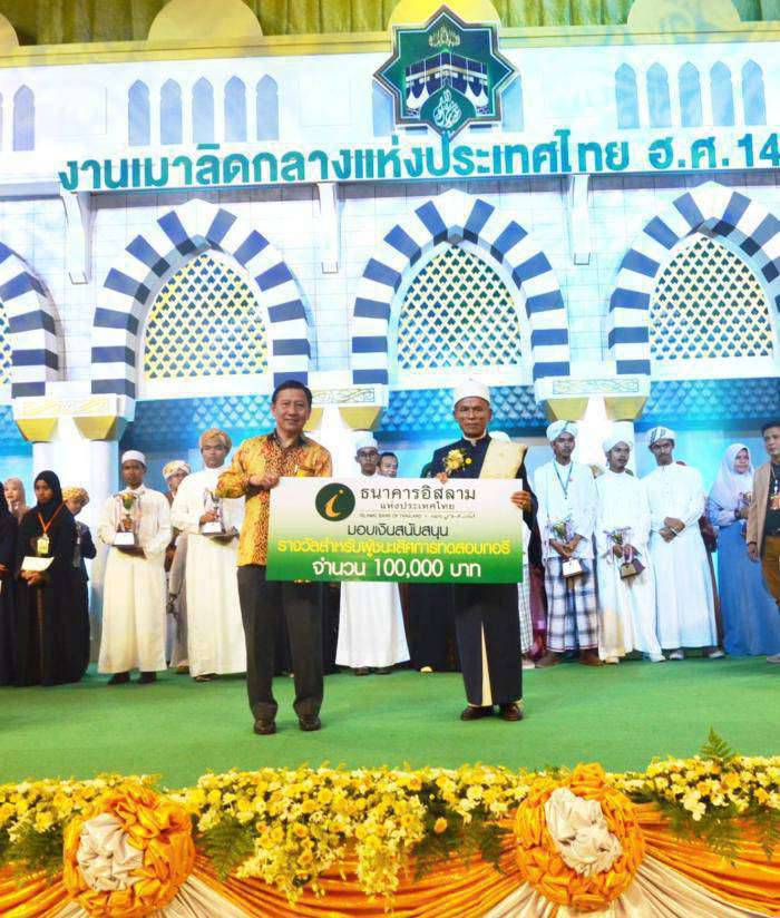จากนั้นเสด็จฯ เข้าสู่ที่ประทับภายในศูนย์บริหารกิจการศาสนาอิสลามแห่งชาติฯ ประทับพระราชอาสน์บนเวที นายนิพนธ์ ฮะกีมี ประธานอนุกรรมการบริหารธนาคารอิสลามแห่งประเทศไทย (ผู้แทนประธานกรรมการ) เข้าเฝ้าฯ ทูลเกล้าฯ ถวายเงิน เพื่อโดยเสด็จพระราชกุศลตามพระราชอัธยาศัย ในฐานะผู้สนับสนุนหลักของการจัดงาน “เมาลิดกลางแห่งประเทศไทย ฮ.ศ. 1440” และเข้ารับพระราชทานโล่เกียรติคุณ จากนั้นเสด็จฯ เยี่ยมชมบูธธนาคารอิสลามแห่งประเทศไทย โดยมีนายวุฒิชัย สุระรัตน์ชัย กรรมการและผู้จัดการธนาคาร ถวายรายงานผลการดำเนินงานที่ผ่านมาพอสังเขป พร้อมด้วยนายชัยชาญ พลานนท์ กรรมการธนาคาร นางอัมพร ปุรินทร์วรกุล กรรมการธนาคารอาจารย์ปราโมทย์ มีสุวรรณ ที่ปรึกษาด้านศาสนา และผู้บริหารธนาคารร่วมรับเสด็จฯ