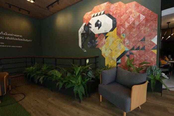 นายชาญศิลป์ ตรีนุชกร ประธานเจ้าหน้าที่บริหารและกรรมการผู้จัดการใหญ่ ปตท. เปิดเผยว่า ปตท. ภาคภูมิใจที่ได้ร่วมผลักดันการพัฒนาผลิตภัณฑ์และบริการที่เป็นมิตรต่อสิ่งแวดล้อม เพื่อกระตุ้นการเติบโตของตลาดผลิตภัณฑ์สีเขียวในประเทศอย่างต่อเนื่องตลอดระยะเวลา40 ปีที่ผ่านมาซึ่งปัจจุบัน ปตท.ยังคงยึดถือเจตนารมณ์เดิมไว้ไม่เปลี่ยนแปลงโดยดำเนินการผ่านสถาบันนวัตกรรม ปตท. และบริษัทในกลุ่ม ปตท. เพื่อให้คนไทยมีทางเลือกในการอุปโภคและบริโภคผลิตภัณฑ์ที่มีคุณภาพ ในราคาเป็นธรรม และไม่ทำลายสภาพแวดล้อม สำหรับร้านคาเฟ่ อเมซอน สาขา พีทีที สเตชั่นสามย่านแห่งนี้ สถาบันนวัตกรรม ปตท.ได้นำเยื่อกาแฟ (Coffee Chaff) ซึ่งเป็นของเหลือหลักจากโรงคั่วกาแฟ นำมาบดและอบเพื่อไล่ความชื้น และขึ้นรูปเป็นวัสดุคอมโพสิต ร่วมกับน้ำยา อีพอกซี เรซิน (Bio-Based Epoxy) เพื่อใช้เป็นวัสดุตั้งต้นในการทำโต๊ะ ตู้ เคาน์เตอร์ชั้นวางของ และเฟอร์นิเจอร์โดยจุดเด่นของผลิตภัณฑ์ คือ น้ำหนักเบา แข็งแรงทนทาน รับน้ำหนักได้มาก ผิวมันวาว คงทนต่อสารเคมีได้ดี เป็นการนำเยื่อกาแฟมาใช้ประโยชน์ได้เป็นอย่างดี เป็นไปตามหลักเศรษฐกิจหมุนเวียน (Circular Economy) ซึ่งเป็นการนำทรัพยากรมาใช้อย่างเต็มประสิทธิภาพและเกิดประโยชน์สูงสุด