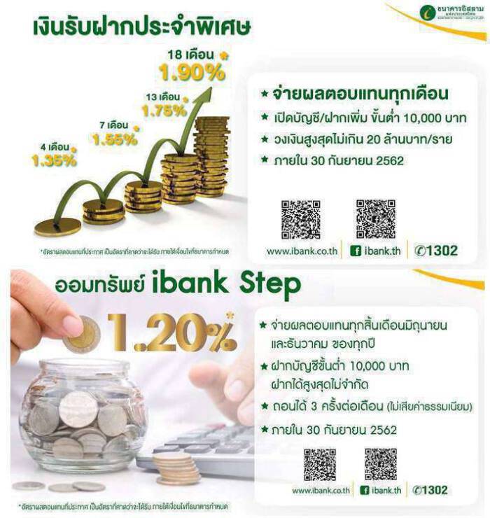 ธนาคารอิสลามแห่งประเทศไทย (ไอแบงก์) ประกาศปรับอัตราผลตอบแทนที่คาดว่าจะได้รับเงินรับฝากประจำพิเศษที่มีระยะเวลารับฝากสูงสุด 18 เดือน เป็น 1.90% ต่อปี พร้อมขยายเวลาเงินรับฝากออมทรัพย์ ibank Step ที่มีผลตอบแทนที่คาดว่าจะได้รับ 1.20% ต่อปี ไปจนถึงวันที่ 30 กันยายน 2562