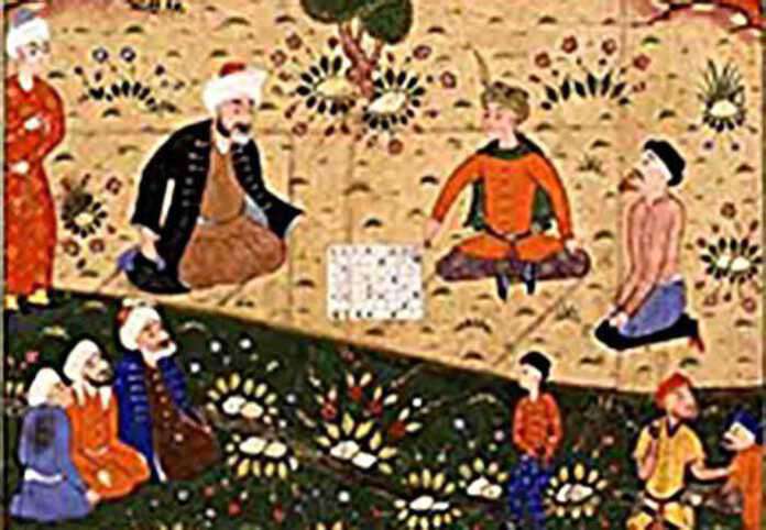 รูป ที่ 1 : ต้นฉบับ ดิวาน อิ ชัมซี ตับริซี (Divan – Shamse Tabrizi) แห่งศตวรรษที่ 15-16 เป็นภาพวาดขณะ ชัมซี ตับริซี กำลังเล่นหมากรุกกับเจ้าชายหนุ่มแห่งเปอร์เซีย ผลงานอันยิ่งใหญ่นี้เป็นงานเขียนชิ้นสำคัญของ ญะลาลุดดีน มุฮัมมัด รูมี