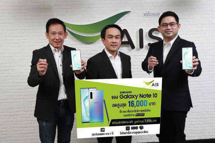 - จัดเต็มข้อเสนอสุดพิเศษ เฉพาะช่วงสั่งซื้อล่วงหน้าเท่านั้น! รับส่วนลดค่าเครื่องสูงสุด16,000 บาทเริ่มต้นเพียง 16,900 บาท จากราคาปกติ 32,900 บาท เมื่อจอง Samsung Galaxy Note 10(256GB) พร้อมสมัครแพ็กเกจ AIS HOT DEAL MAXX 1,549บาทขึ้นไป และชำระค่าบริการล่วงหน้า 5,500 บาทพร้อมชมฟรี!คอนเทนท์ความบันเทิงระดับโลกจาก HBO และ Warner TV ผ่านแอปฯ AIS PLAY แบบไม่คิดค่าเน็ต นานสูงสุด6 เดือน มูลค่า 1,194บาท และประกันจอแตกนาน 1 ปี มูลค่า 6,500บาท รวมมูลค่าทั้งสิ้น 7,694บาท สำหรับลูกค้าเอไอเอสรายเดือน ทั้งลูกค้าปัจจุบัน เปิดเบอร์ใหม่ หรือเปลี่ยนจากเติมเงินเป็นรายเดือน พิเศษสำหรับลูกค้าย้ายค่ายเบอร์เดิม รับส่วนลดเพิ่มอีก 1,000 บาท