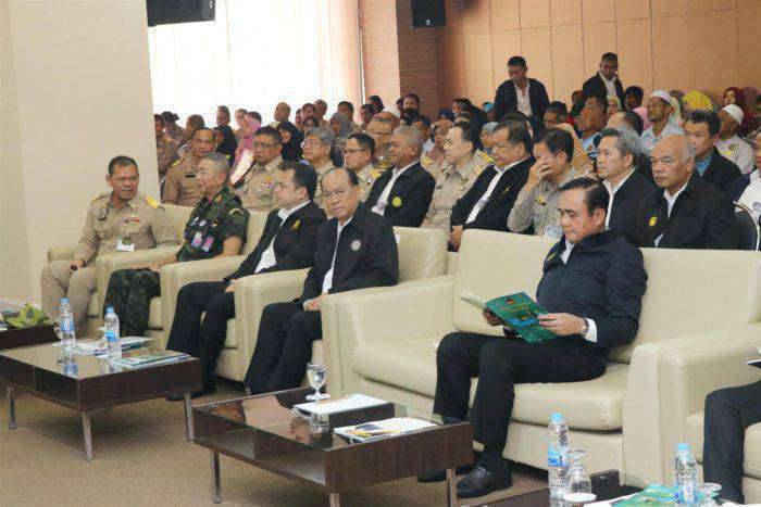 ในการนี้ พลเอก ประยุทธ์ จันทร์โอชา นายกรัฐมนตรีและรัฐมนตรีว่าการกระทรวงกลาโหม กล่าวว่า ในช่วง 2-3 ปีที่ผ่านมามาตรการการลงทุนในจังหวัดชายแดนภาคใต้มีความก้าวหน้ามากขึ้น ทำให้มีการลงทุนมากขึ้น ทั้งมะพร้าว ทุเรียน และอีกหลายอย่างที่กำลังเกิดขึ้น ซึ่งวันนี้มารับฟังการรายงานพบว่าจะยังมีอีกหลายประเด็นยังสื่อสารไม่ถึงในระดับรัฐบาล สำหรับการพัฒนาได้รับการรายงานจาก ศอ.บต. ว่าการพัฒนาดีขึ้น และยังมีบางส่วนที่ต้องได้รับการแก้ไข เพราะเชื่อว่าทุกปัญหาย่อมมีอุปสรรคและต้องมีการแก้ไข จากการสัมผัสและพบกับประชาชนสองข้างทางรวมถึงสังเกตจากร้านค้าต่าง ๆ พบว่ามีชีวิตชีวามากกว่าเดิมหากเปรียบเทียบกับที่ผ่านมาพบว่าดีขึ้นตามลำดับ และการรับฟังรายงานจากพื้นที่พบว่าการจัดงานประเพณีต่าง ๆ มีคนร่วมงานมากขึ้น มีเหตุความรุนแรงในพื้นที่น้อยลงแม้จะใกล้เข้าสู่ช่วงเทศกาลวันฮารีรายออิดิลอัฎฮา ทำให้มีความพอใจในมาตการการแก้ไขปัญหาในพื้นที่ระดับหนึ่ง สำหรับสิ่งที่ทุกคนคาดหวังรัฐบาลจะเป็นผู้ดูแลและต้องเร่งรัดติดตาม โดยต้องเข้าไปปรับแผนศึกษาเพิ่มเติม ทั้งเรื่องถนนเลี่ยงเมือง ถนนสี่เลน และรถไฟรางคู่ ซึ่งจะหาทางบรรจุในแผนให้ได้ เพราะต้องพัฒนาหลายพื้นที่ไปพร้อม ๆ กัน และต้องมีการหารือกับประเทศเพื่อนบ้านอย่างมาเลเซีย เพื่อการทำงานร่วมกันด้วย สำหรับราคายางพาราในประเทศอื่น ๆ ก็มีราคาไม่สูงนักเพราะมีปัญหาในเรื่องราคายางที่เป็นภาพรวมระดับโลก ซึ่งการผลิตเป็นห่วงโซ่ร่วมกัน เช่นการปลูกทุเรียน ยาง ปาล์ม หากมีการปลูกมากขึ้นก็อาจจะล้นตลาดมากขึ้น ซึ่งรัฐบาลก็ต้องแก้ปัญหาทั้งข้างในและข้างนอก และที่สำคัญทุกคนต้องปรับเปลี่ยนตัวเองด้วย การปลูกพืชเชิงเดี่ยวจะทำให้มีปัญหาจึงจำเป็นที่ต้องศึกษาทางการตลาดมากขึ้นด้วย ดังนั้นต้องแก้ไขปัญหาที่ต้นทาง ทั้งผู้ปลูก ผู้ผลิต ด้วยการแปรรูปให้สามารถลดต้นทุนเพราะแม้ราคาจะปรับตามกลไกตลาดแต่ก็ยังพอมีทุนเหลือ ฉะนั้นการเร่งพัฒนาในพื้นที่ขณะนี้คือ ความมั่นคง ให้มีความปลอดภัยในชีวิตและทรัพย์สิน เศรษฐกิจ ให้มีการพัฒนาและการลงทุนมากขึ้น และการพัฒนาคุณภาพชีวิตโดยเฉพาะการพัฒนาด้านการศึกษาในพื้นที่