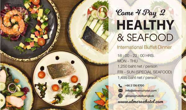 - วันจันทร์ – วันพฤหัสบดี Healthy & International Buffet Dinner ราคา 1,250 บาท/คน เด็กอายุ 4-11 ปี 450 บาท/คน