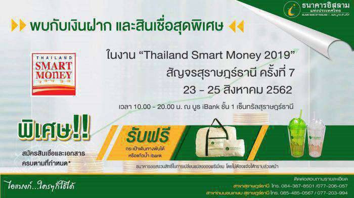 ธนาคารอิสลามแห่งประเทศไทย (ไอแบงก์) ล่องใต้ลุยงาน Thailand Smart Money สุราษฎร์ธานี ขนโปรโมชั่นบริการด้านการเงินอย่างครบเครื่อง ไม่ว่าจะเป็นสินเชื่อที่อยู่อาศัย จะซื้อ จะซ่อม จะสร้าง หรือรีไฟแนนซ์ อัตรากำไรเริ่มต้นที่ 2.25% ต่อปี สินเชื่อเพื่อธุรกิจทุกขนาด เงินฝากประจำพิเศษ ที่มอบอัตราผลตอบแทนที่คาดว่าจะได้รับสูงสุด 1.90% ต่อปี พร้อมด้วยบริการตะกาฟุลทุกประเภทให้เลือก