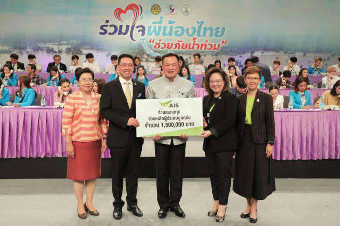 วันที่ 18 กันยายน 2562  บริษัท แอดวานซ์ อินโฟร์ เซอร์วิส จำกัด (มหาชน) หรือ เอไอเอส โดย นางสาวกานติมา เลอเลิศยุติธรรม หัวหน้าคณะผู้บริหารด้านทรัพยากรบุคคล เป็นตัวแทนมอบเงินช่วยเหลือผ่านภาครัฐ จำนวน 1.5 ล้านบาท โดยมี พลเอก ประยุทธ์ จันทร์โอชา นายกรัฐมนตรี เป็นประธานและมีนายอนุทิน ชาญวีรกูล รองนายกรัฐมนตรีและรัฐมนตรีว่าการกระทรวงสาธารณสุข เป็นผู้รับมอบ ในโครงการ “ร่วมใจ พี่น้องไทย ช่วยภัยน้ำท่วม” เพื่อให้รัฐบาลนำไปจัดสรรช่วยเหลือประชาชนในพื้นที่ประสบภัยต่อไปโดยมีนายพุทธิพงษ์ ปุณณกันต์รัฐมนตรีว่าการกระทรวงดิจิทัลเพื่อเศรษฐกิจและสังคม พร้อมด้วย น.ส.อัจฉรินทร์ พัฒนพันธ์ชัยปลัดกระทรวงดิจิทัลเพื่อเศรษฐกิจและสังคม เข้าร่วมด้วย ณ อสมท