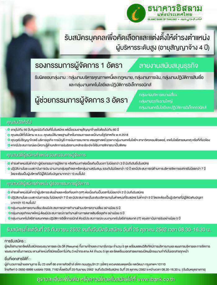 ธนาคารอิสลามแห่งประเทศไทย (ไอแบงก์) ประกาศรับสมัครผู้บริหารสัญญาจ้าง (ระดับสูง) เพื่อคัดเลือกเข้าดำรง ตำแหน่ง รองกรรมการผู้จัดการ 1 อัตรา และผู้ช่วยกรรมการผู้จัดการ 3 อัตรา โดยมีอายุสัญญาจ้างคราวละ 4 ปี กำหนดรับสมัครตั้งแต่วันที่ 25 กันยายน – 25 ตุลาคม ศกนี้