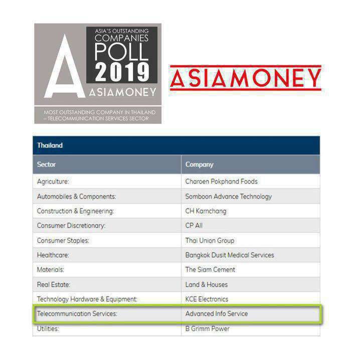วันที่ 26 กันยายน 2562 : บมจ.แอดวานซ์ อินโฟร์ เซอร์วิส หรือ AIS ตอกย้ำความสำเร็จ ผู้นำอันดับ 1 ในอุตสาหกรรมโทรคมนาคมของประเทศ ยืนหนึ่งโอเปอร์เรเตอร์รายเดียวในไทย คว้ารางวัลบริษัทยอดเยี่ยมในภูมิภาคเอเชีย ในกลุ่มโทรคมนาคม(Asiamoney Asia’s Outstanding Companies: Telecommunication Services Sector) ต่อเนื่องเป็นปีที่ 2 จาก Asiamoney Awards จัดโดย  Asiamoney นิตยสารด้านการเงินชั้นนำที่มีผู้อ่านมากที่สุดในภูมิภาคเอเชีย สะท้อนถึงความมั่นคงด้านผลประกอบการ และความเข้มแข็งด้านการดำเนินธุรกิจในฐานะ “ผู้ให้บริการด้านเครือข่ายและบริการดิจิทัล” ตลอดจนยึดมั่นในการดำเนินธุรกิจตามหลักธรรมาภิบาล และมีความรับผิดชอบต่อผู้มีส่วนได้ส่วนเสียในทุกระดับ และสร้างสรรค์ประโยชน์เพื่อสังคมมาอย่างต่อเนื่อง