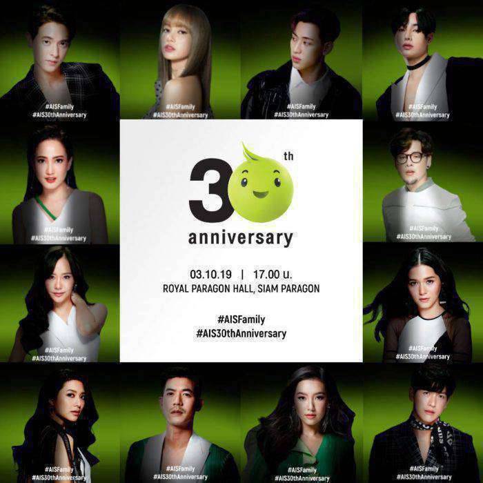 เอไอเอส ฉลองครบ 30 ปี จัดงานแถลงข่าวและขอบคุณลูกค้าสุดยิ่งใหญ่ ในวันพฤ.ที่ 3 ตุลาคม 2562 เวลา 17.00 น. ณ รอยัล พารากอน ฮอลล์ ชั้น 5 สยามพารากอน พบกับการรวมตัวของ 12 พรีเซนเตอร์สุดฮอต ได้แก่ เจมส์ จิรายุ, เป็ก ผลิตโชค, ทอม อิศรา, เต้ย จรินทร์พร, แต้ว ณฐพร, มิว นิษฐา, พุฒ พุฒิชัย, วี วิโอเลต, เวียร์ ศุกลวัฒน์, เบลล่า ราณี, แบมแบม กันต์พิมุกต์, ลิซ่า ลลิษา ที่จะมามอบความสุขและความสนุกครั้งยิ่งใหญ่ ที่ทำให้ทุกคนอุ่นใจยิ่งกว่าเดิม