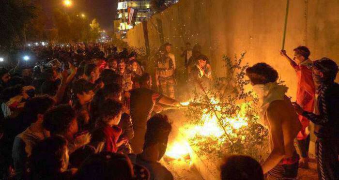 ผู้ประท้วงยกธงอิรักขึ้นที่สำนักงานการทูตอิหร่าน ตะโกนสโลแกนเรียกร้องให้ขับไล่สมาชิกกงสุล ขว้างก้อนหินและจุดไฟเผาที่สำนักงานใหญ่ใกล้ๆ