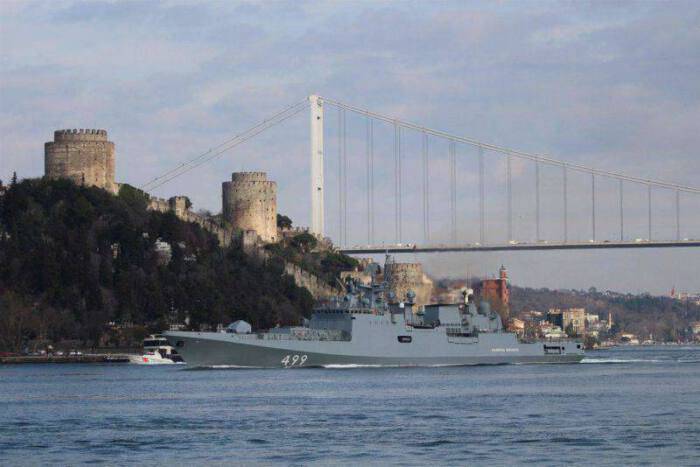 วิดีโอที่โพสต์บนโซเชียลนั้นเผยให้เห็นเรือรบรัสเซียสองลำคือ Admiral Grigorovich และ Admiral Makarov แล่นผ่านช่องแคบบอสพอรัสซึ่งเป็นจุดเดินเรือสำคัญที่ควบคุมโดยตุรกี เพื่อไปยังชายฝั่งของซีเรีย