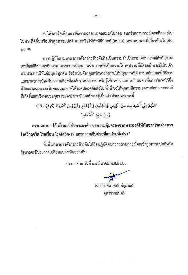 นอกจากนี้ให้งดจัดกิจกรรมและการรวมตัวเป็นกลุ่มของชาวมุสลิม รวมทั้งให้เลื่อนการจัดงานงานมงคลสมรสออกไปก่อน จนกว่าสถานการณ์จะดีขึ้น