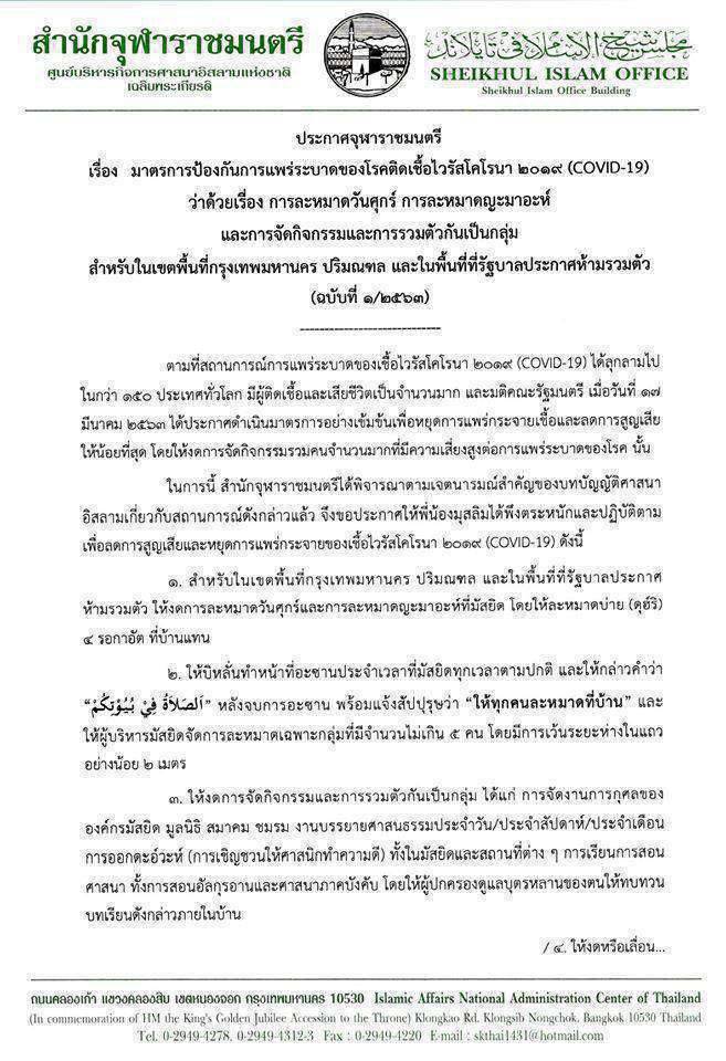 คำสั่งดังกล่าวเป็นไปตาม ประกาศจุฬาราชมนตรี ฉบับที่ 1/2563 ลงวันที่ 18 มีนาคม 2563 ลงนามโดยนายอาสิส พิทักษ์คุมพล จุฬาราชมนตรี เรื่อง มาตรการป้องกันการแพร่ระบาดของโรคติดเชื้อไวรัสโคโรนา 2019 (COVID-19) ว่าด้วยเรื่อง การละหมาดวันศุกร์ การละหมาดญะมาอะห์ และการจัดกิจกรรมและการรวมตัวกันเป็นกลุ่ม สำหรับในเขตพื้นที่กรุงเทพมหานคร ปริมณฑล และในพื้นที่ที่รัฐบาลประกาศห้ามรวมตัว
