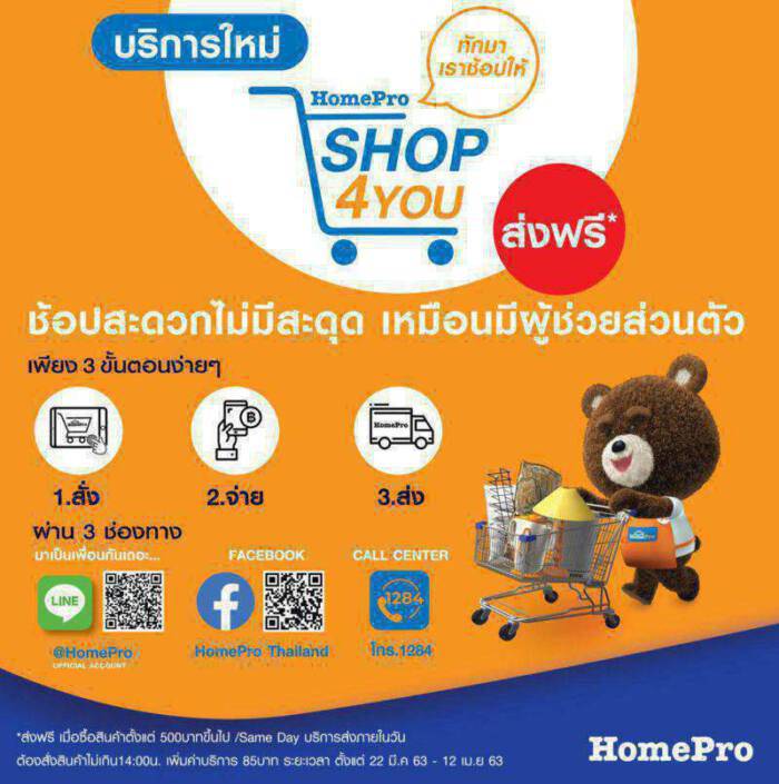 โฮมโปร ห่วงใยด้านสุขภาพลูกค้า จากไวรัส โควิด-19 เปิดเกมรุกเขย่าตลาด ช้อปออนไลน์หลังปิดสาขาชั่วคราว 22 วัน เปิดตัวบริการใหม่ SHOP4YOU เพียงแอดไลน์ เพิ่มเพื่อน @Homepro ทักมาเราช้อปให้ แค่นี้ง่ายๆ ก็มีผู้ช่วยส่วนตัวในการซื้อสินค้าที่โฮมโปร ได้ทุกสาขา หรือสั่งทาง Facebook HomePro Thailand และ Call Center 1284 ง่ายแค่ปลายนิ้ว เพียงแคปหน้าจอ หรือถ่ายรูปสินค้าที่คุณต้องการแล้วส่งมาหาเรา พร้อมส่งฟรีทั่วไทย ตลอด 24 ชั่วโมง เริ่ม 24 มี.ค.นี้