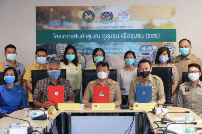 วันที่ 23 มีนาคม 2563 เวลา 9:30 น. นายสุทธิพงษ์ จุลเจริญ อธิบดีกรมการพัฒนาชุมชน ผู้แทนกรมการพัฒนาชุมชน (พช.) และ นายวัชรพงศ์ ระดมสิทธิพัฒน์ ประธาน OTOP เทรดเดอร์ (ประเทศไทย) ร่วมกับ นายภาณุพล รัตนกาญจนภัทร ผู้อำนวยการองค์การตลาด ผู้แทนองค์การตลาด (อต.) ร่วมบันทึกข้อตกลงความร่วมมือโครงการสินค้าชุมชน สู่ชุมชน เพื่อชุมชน เพื่อสร้างรายได้ผ่านการสร้างตราสินค้า”อต. Select” โดยมี นางวิไลวรรณ ไกรโสดา รองอธิบดีกรมการพัฒนาชุมชน และนายวิทยา ทรัพย์เย็น รองผู้อำนวยการองค์การตลาด และ ณ ห้องประชุมใหญ่ชั้น 3 องค์การตลาด สำนักงานใหญ่ ตำบลสวนผัก ซอย 4 เขตตลิ่งชัน กรุงเทพฯ