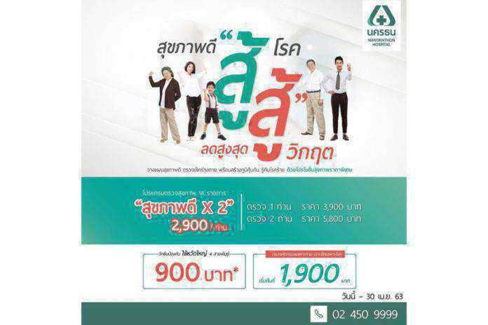 โรงพยาบาลนครธน จัดโปรโมชั่นสุขภาพดี “สู้” โรค ลดสูงสุด “สู้” วิกฤต ช่วยวางแผนสุขภาพดีให้ประชาชนด้วยการตรวจเช็คร่างกาย พร้อมสร้างภูมิคุ้มกัน รู้ทันโรคร้าย ด้วยโปรโมชั่นสุขภาพราคาพิเศษ ได้แก่ 1. โปรแกรมตรวจสุขภาพ 14 รายการ หากซื้อเป็นคู่ จะเหลือเพียงท่านละ 2,900 บาท (จากปกติท่านละ 3,900 บาท) 2. วัคซีนป้องกันไข้หวัดใหญ่ 4 สายพันธุ์ ราคา 900 บาท เฉพาะผู้ใหญ่ (รวมค่าแพทย์และค่าบริการโรงพยาบาล) และ 3. ตรวจคัดกรองเฉพาะทาง เจาะลึกเฉพาะโรค เริ่มต้นที่ 1,900 บาท (รวมค่าแพทย์และค่าบริการโรงพยาบาล) สำหรับผู้ที่สนใจสามารถซื้อโปรโมชั่นได้ตั้งแต่ วันที่ 24 มีนาคม – 30 เมษายน 2563 หรือ สอบถามรายละเอียดเพิ่มเติมได้ที่ Contact Center 0-2450-9999