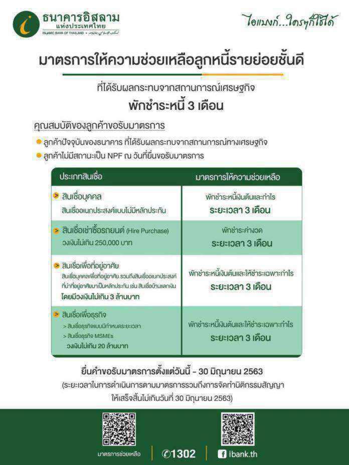 ธนาคารอิสลามแห่งประเทศไทย (ไอแบงก์) ออกมาตรการการช่วยเหลือทุกกลุ่มลูกค้าที่ได้รับผลกระทบจากภาวะเศรษฐกิจ ให้พักชำระหนี้เป็นเวลา 3 เดือน สามารถยื่นคำขอได้สะดวก เพียงดาวน์โหลดใบคำขออนุมัติเปลี่ยนแปลงเงื่อนไขการชำระหนี้ฯ ผ่านทางเว็บไซต์ www.ibank.co.th และส่งกลับมายังอีเมล COVID19@ibank.co.th ตั้งแต่วันที่ 1 เมษายน – 30 มิถุนายน 2563