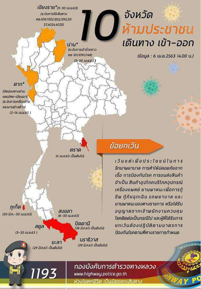 6 เม.ย. 63 เพจเฟซบุ๊ก ศ.ดร.นฤมล ภิญโญสินวัฒน์ โฆษกรัฐบาล ได้เผยแพร่ข้อมูลจากกองบังคับการตำรวจทางหลวง เผย 10 จังหวัดล็อคดาวน์ ห้ามประชาชนเดินทางเข้าออกเพื่อป้องกันและควบคุมการแพร่ระบาดของเชื้อไวรัสโคโรนา 2019 (โควิด-19)