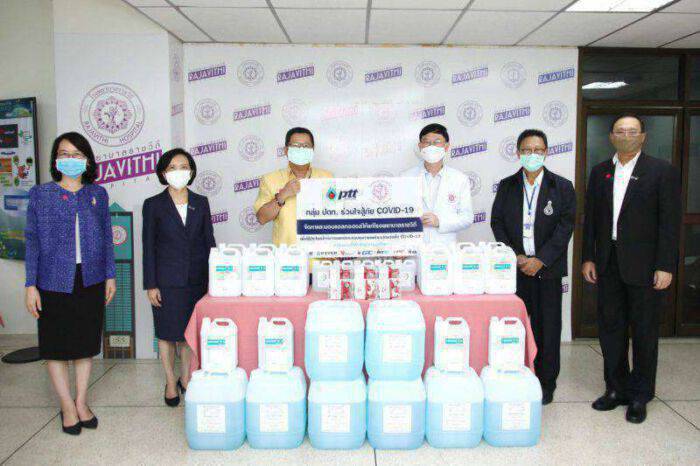 เมื่อเร็วๆ นี้ – นายชาญศิลป์ ตรีนุชกร ประธานเจ้าหน้าที่บริหารและกรรมการผู้จัดการใหญ่ บริษัท ปตท. จำกัด (มหาชน) นำแอลกอฮอล์ที่ได้จัดซื้อจากโรงงานผลิตแอลกอฮอล์ในประเทศ และจัดหาเพิ่มเติมในรูปแบบต่างๆ ได้แก่ แอลกอฮอล์ความเข้มข้น 70 เปอร์เซ็นต์ เจลแอลกอฮอล์ และสเปรย์ฆ่าเชื้อ เนื่องจาก ปตท. ไม่มีโรงงานผลิตแอลกอฮอล์เป็นของตนเอง มอบให้แก่โรงพยาบาลราชวิถี โดยมีนายแพทย์สมเกียรติ ลลิตวงศา ผู้อำนวยการโรงพยาบาลราชวิถี เป็นผู้รับมอบ เพื่อนำไปใช้ประโยชน์ทางการแพทย์ และควบคุมการแพร่ระบาดของเชื้อไวรัส COVID-19 ต่อไป