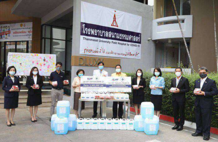 9 เมษายน 2563 – นายชาญศิลป์  ตรีนุชกร ประธานเจ้าหน้าที่บริหารและกรรมการผู้จัดการใหญ่ บริษัท ปตท. จำกัด (มหาชน) (กลางขวา) พร้อมด้วยคณะผู้บริหาร เป็นผู้แทน ปตท. บริจาคเงินจำนวน 2.5 ล้านบาท เพื่อสนับสนุนการเปิดโรงพยาบาลสนาม และจัดหาแอลกอฮอล์ทั้งในรูปแบบเจล และสเปรย์เพิ่มเติมจากผู้ผลิต เนื่องจาก ปตท. ไม่มีโรงงานผลิตแอลกอฮอล์ของตนเอง เพื่อมอบให้แก่โรงพยาบาลสนามธรรมศาสตร์ โดย รศ. เกศินี วิฑูรชาติ อธิการบดีมหาวิทยาลัยธรรมศาสตร์ (ที่ 4 จากซ้าย) และ ผศ.นพ.ฉัตรชัย มิ่งมาลัยรักษ์ ผู้อำนวยการโรงพยาบาลสนามธรรมศาสตร์ (กลางซ้าย) เป็นผู้รับมอบ ทั้งนี้ กลุ่ม ปตท. ยังมอบสตรอว์เบอร์รี Harumiki ที่ปลูกโดยใช้ความเย็นจากกระบวนการแปรสภาพก๊าซธรรมชาติเหลว (LNG) เพื่อเป็นกำลังใจการทำงานแก่บุคลากรทางการแพทย์ในครั้งนี้ด้วย